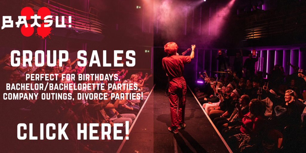 Audience members enjoy sushi and sake, while the bravest may even sign up for a chance to participate to win prizes!